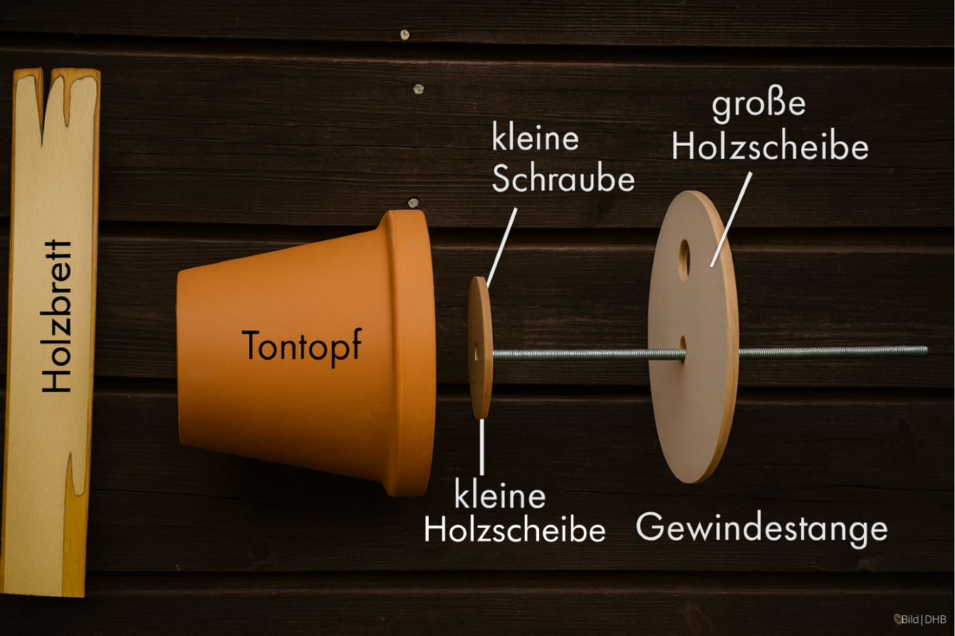 Stecke den Tontopf über die Gewindestange. Setze die große Holzscheibe davor und sichere alles mit der Flügelmutter.