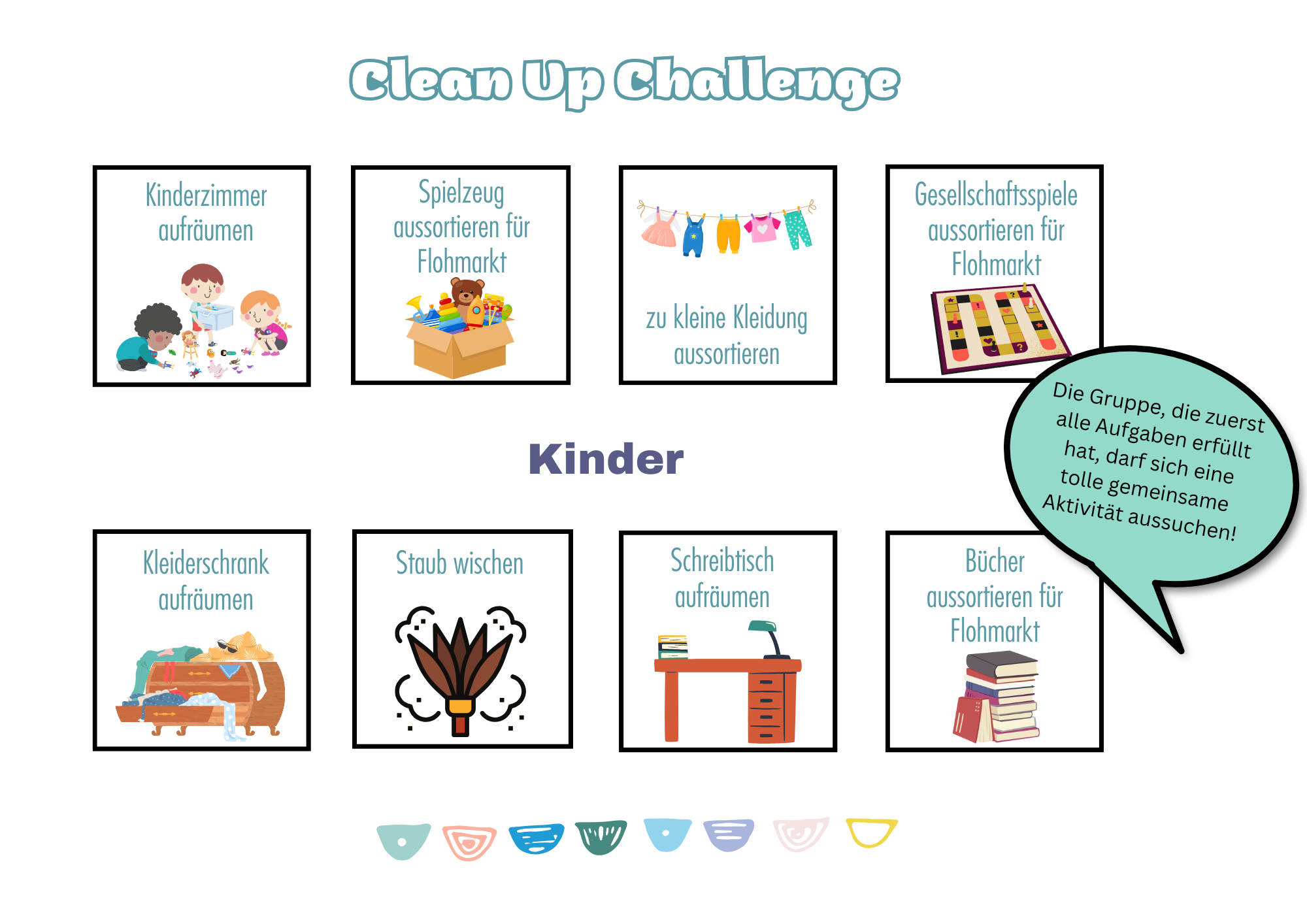 Wer nun Interesse daran hat, selber eine Clean Up Challenge mit der Familie zu veranstalten, kann zum Beispiel die von uns erstellte Vorlage nutzen. Die Aufgaben können dabei natürlich noch bei Bedarf an die eigenen Bedürfnisse angepasst werden. Wer die Vorlage ausdrucken möchte, kann zudem die an den Artikel angehängte PDF-Datei herunterladen.