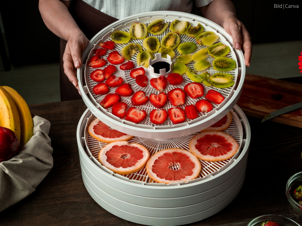 Ein elektrisches Dörrgerät ist eine sehr effiziente und präzise Möglichkeit zum Trocknen – besonders bei regelmäßigem Einsatz. Die Geräte arbeiten mit Umluft, einstellbarer Temperatur und mehreren Einschüben, was eine gleichmäßige und kontrollierte Trocknung ermöglicht. Es gibt sie in verschiedenen Größen und Preisklassen.